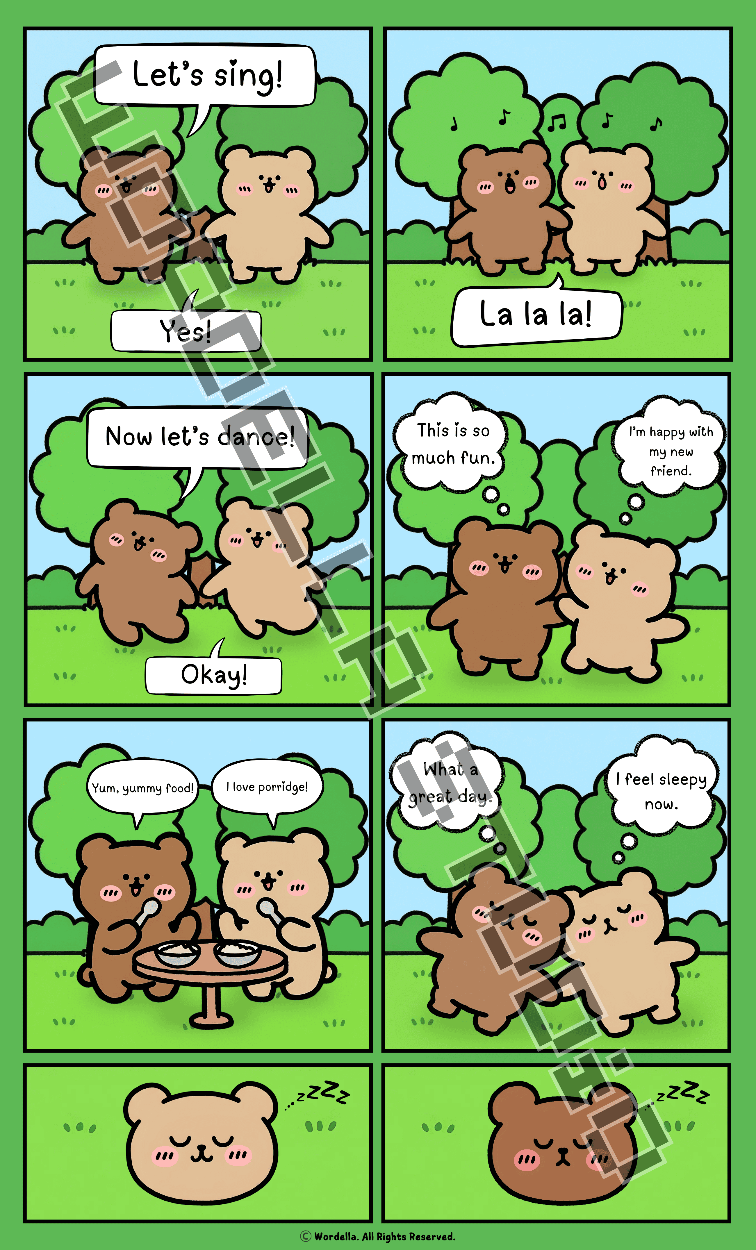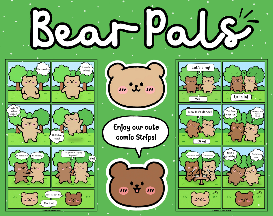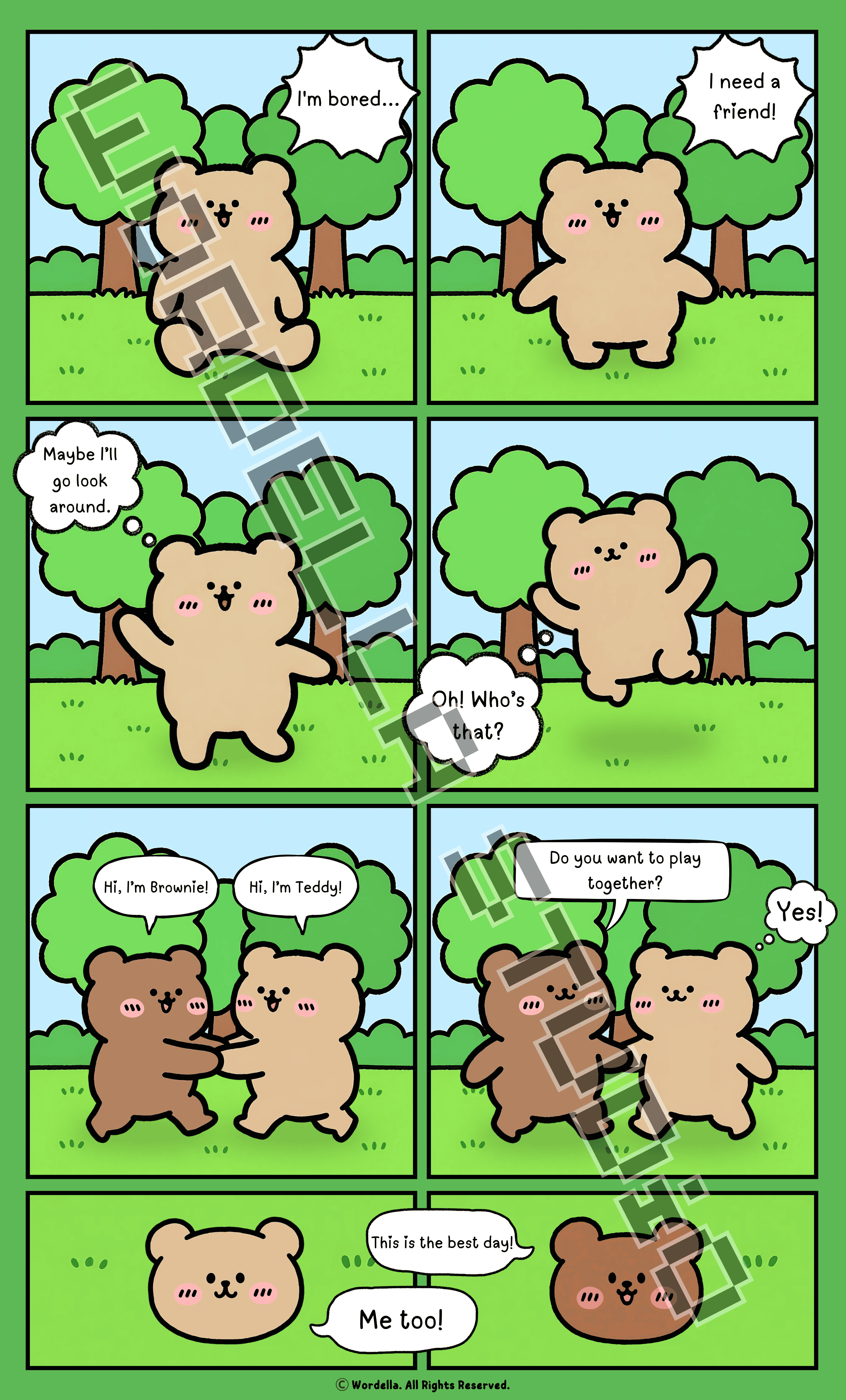 Bear Pals is a two-page comic designed for early readers at the Pre-K, kindergarten, and primary levels. It tells a visual story about two bears who meet in the forest, spend the day playing together, and become friends.