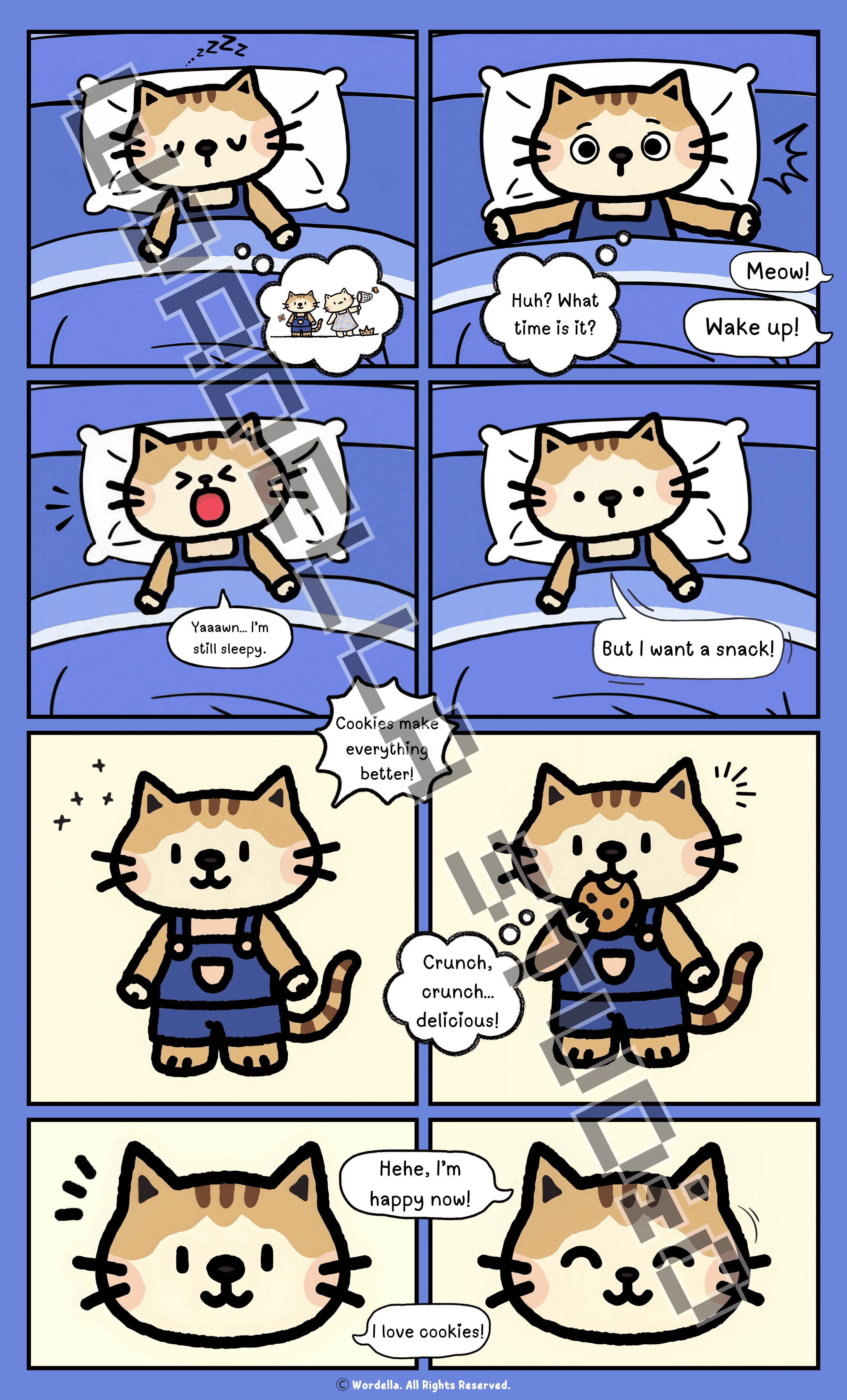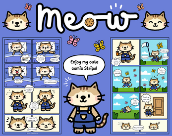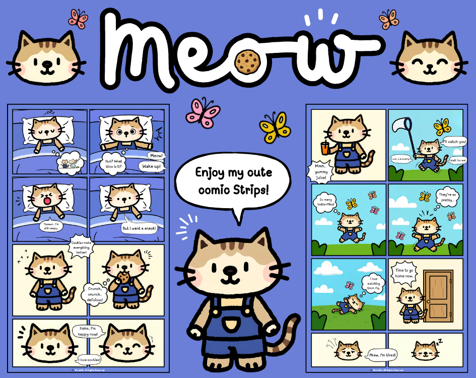 Meow is a two-page comic designed for early readers at the Pre-K, kindergarten, and primary levels. It follows the ordinary day of a cat named Meow, who enjoys eating cookies and spending time chasing butterflies. With clear visuals and short text, the comic is easy to follow and engaging for young children.